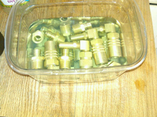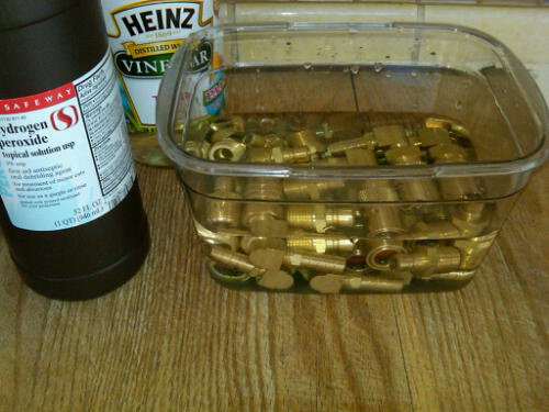 We used a solution of 2 parts white vinegar and one part hydrogen peroxide. This is to remove surface lead from the brass (based on this: http://www.howtobrew.com/appendices/appendixB.html). Not sure if it really matters as many feel the amount of lead in these fittings (meant for potable water) contain very little lead and the odds of any transfering into the beer is minimal.