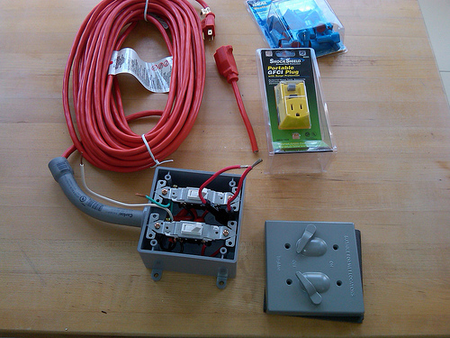 We started with a 50 foot, 16 gauge extension cord. We cut the female end off and put the cut end into the box. The two switches are hooked to the black wire to one terminal of both switches. We put a 2.0 amp, slow blow fuse (inline housing from Radio Shack) on each of the other ends of the switches. We will hook the fuse ends to the black on the pump wires.