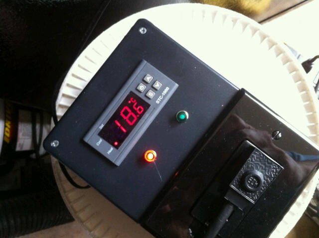 The temp controller is working but reading a bit low. Overshot by almost a full degree as it brought the temps down for the first time. At the lower temp, the “heat” lamp is lit. If we had a heating element, we could have a closer temp.