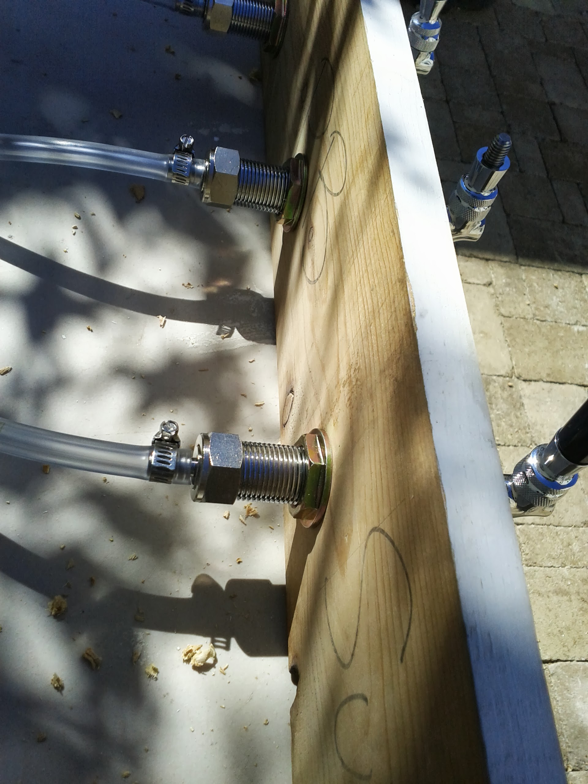 We simply re-drilled the six holes (to one inch) and installed 3 1/8 inch shanks, faucets that we had laying around, and thirty feet of hose (5 feet each). We finished each hose with a 1/4 MFL fitting, as is our custom. This allows us to attach ball, pin or sanke taps.